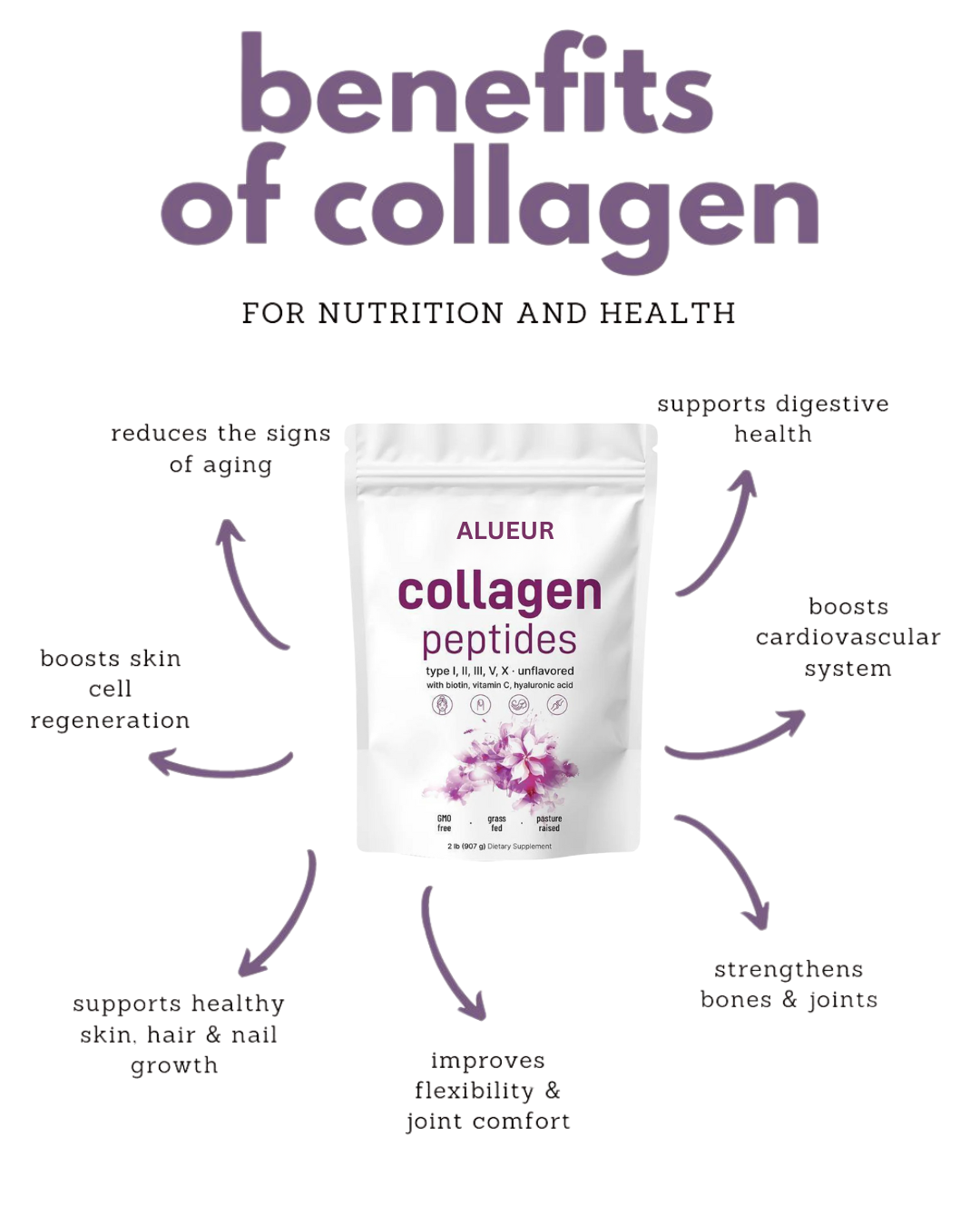 ALUEUR uses a multi-collagen complex that includes Types I, II, III, V & X, delivering full-spectrum support for skin, hair, nails, and joints.