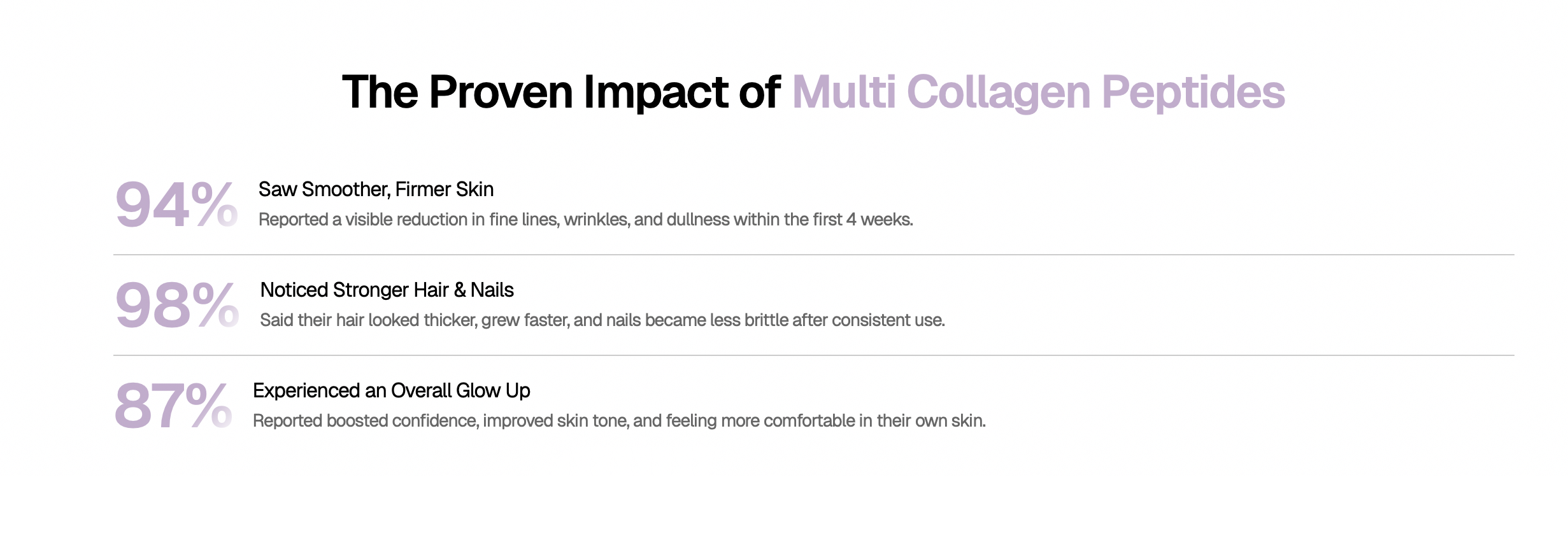Most customers begin noticing improvements within 2–4 weeks — starting with smoother, more hydrated skin and stronger nails.